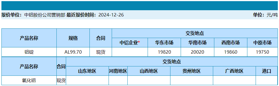 中国铝业2024年12月26日产品报价
